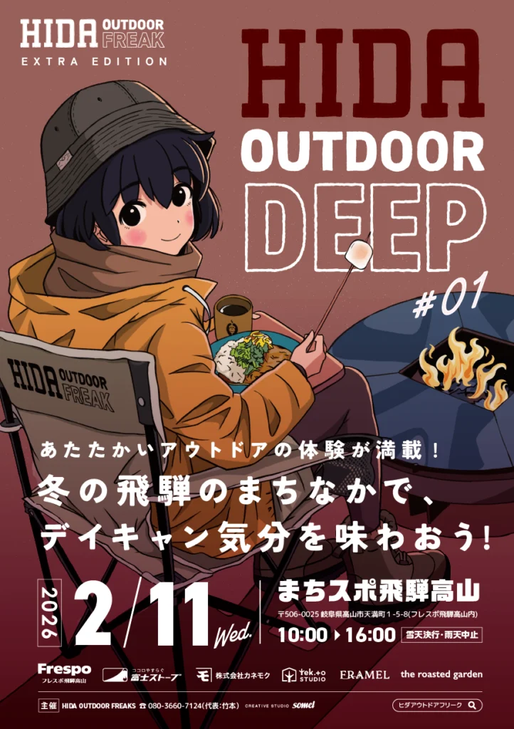 まちスポ飛騨高山で11月9日(日)ヒダアウトドアディープ#05 の初開催が決定!開催時間は9時〜16時。入場無料。雪天決行。初開催となるテーマは「冬のあったかアウトドア」。会場を暖かくキャンプ気分が味わえる空間として設営します。焚き火やキャンドルづくりなどのワークショップをはじめ、スパイスカレーやスペシャルティコーヒーなどの温かい催しをご用意しております。ぜひシェラカップやアウトドアチェアを持参して暖をとりながらゆったりとチルしませんか?