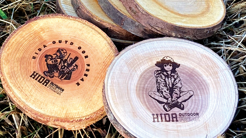 飛騨の間伐材を使ってオリジナルのコースターを作ろう! デザインはアウトドアフリークオリジナルデザインのイラストが焼印された数種類からお選びいただけます。飛騨産のえごま油でコーティングをして、飛騨の香りを感じるコースターを作りましょう。提供はtek. tostudio。